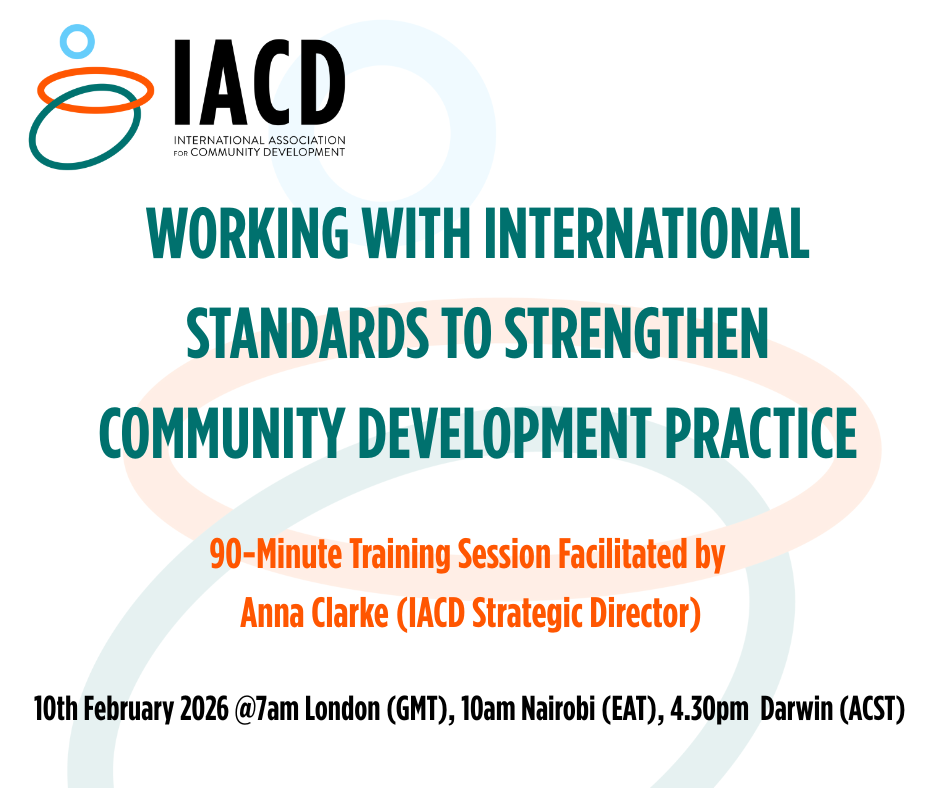 IACD published the International Standards for Community Development, in English, at the 2018 World Community Development Conference in Maynooth, Ireland. They have been adopted by several national professional CD associations and translated into several languages (with more translations in development). You can access the Standards, and a Summary version here: https://www.iacdglobal.org/international_standards_for_community_development