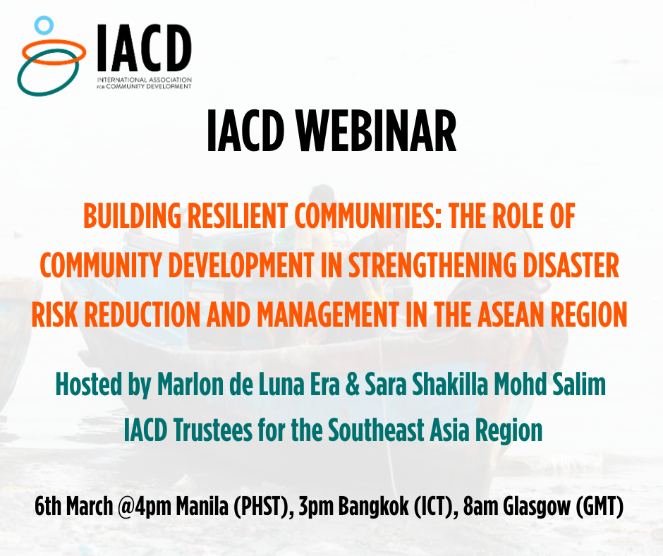 Join us on 6th March for a webinar on Building Resilient Communities: the Role of Community Development in Strengthening Risk Reduction and Management in the ASEAN Region. Hosted by IACD Trustees for Southeast Asia, Marlon de Luna Era and Sara Shakilla Mohd Salim.