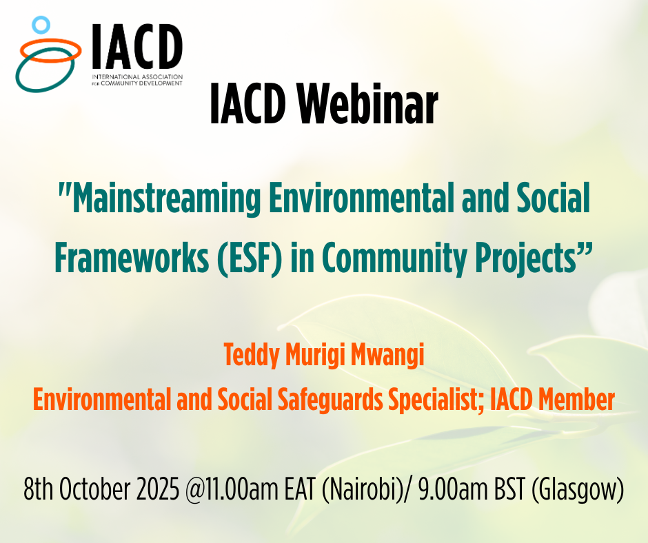Community development projects are the way to improve the wellbeing of community members. The projects have however to be undertaken in ways that promote not only the dignity of community members but also the integrity of their ecosystem. The International Association for Community Development (IACD) is proud to present an essential webinar for community development stakeholders - development professionals, project leaders and managers, and community engagement specialists, community leaders, community development students and community members – to the webinar, "Mainstreaming Environmental and Social Frameworks (ESF) in Community Projects".