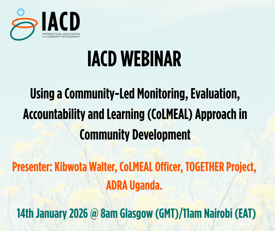 Get the New Year off to a good start and join us on 14th January for an IACD Webinar on Using a Community-Led Monitoring, Evaluation, Accountability and Learning (CoLMEAL) Approach in Community Development. Facilitated by IACD Trustees and with presenter Kibwota Walter, CoLMEAL Officer, TOGETHER Project, ADRA Uganda.