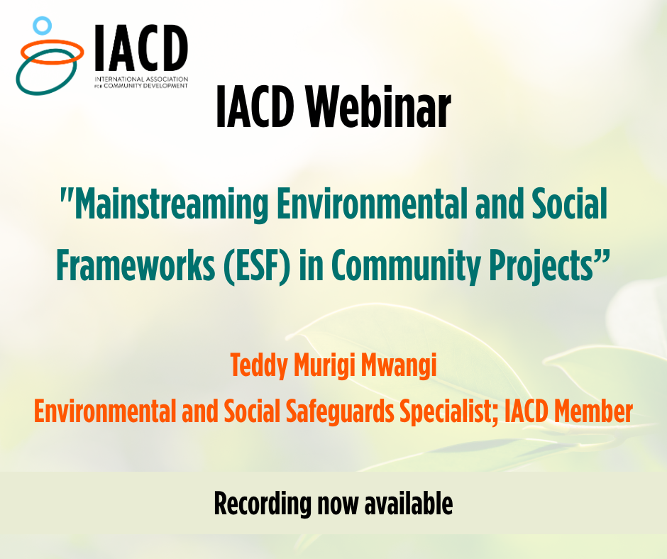 Community development projects are the way to improve the wellbeing of community members. The projects have however to be undertaken in ways that promote not only the dignity of community members but also the integrity of their ecosystem. Watch the recording of our webinar of 8th October 2025 on Mainstreaming Environmental and Social Frameworks in Community Projects, with IACD Member Teddy Murigi Mwangi, Environmental and Social Safeguards Specialist.