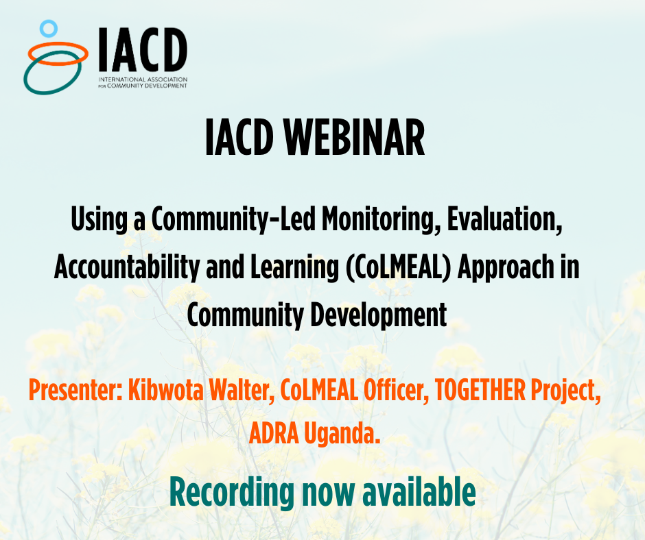 On 14th January 2026 IACD hosted a webinar on Using a Community-Led Monitoring, Evaluation, Accountability and Learning (CoLMEAL) Approach in Community Development. Facilitated by IACD Trustees and with presenter Kibwota Walter, CoLMEAL Officer, TOGETHER Project, ADRA Uganda.